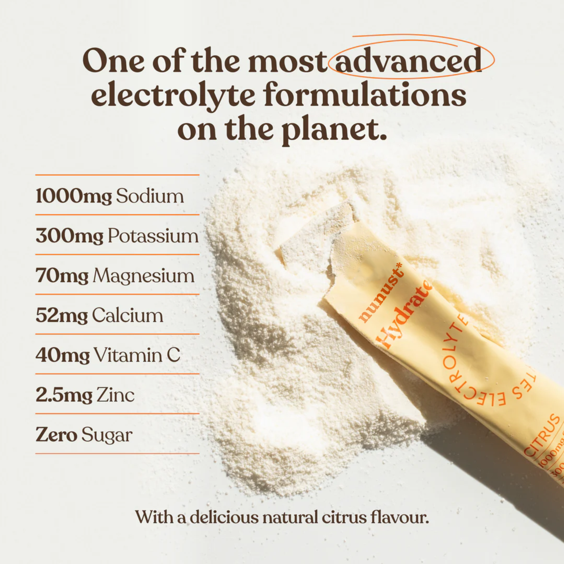 Hydrate has a refreshing Citrus flavour, with a mix of orange and lemon. Electrolytes are minerals so they do taste salty - this is how you know there is a decent sodium content and no added sugar.